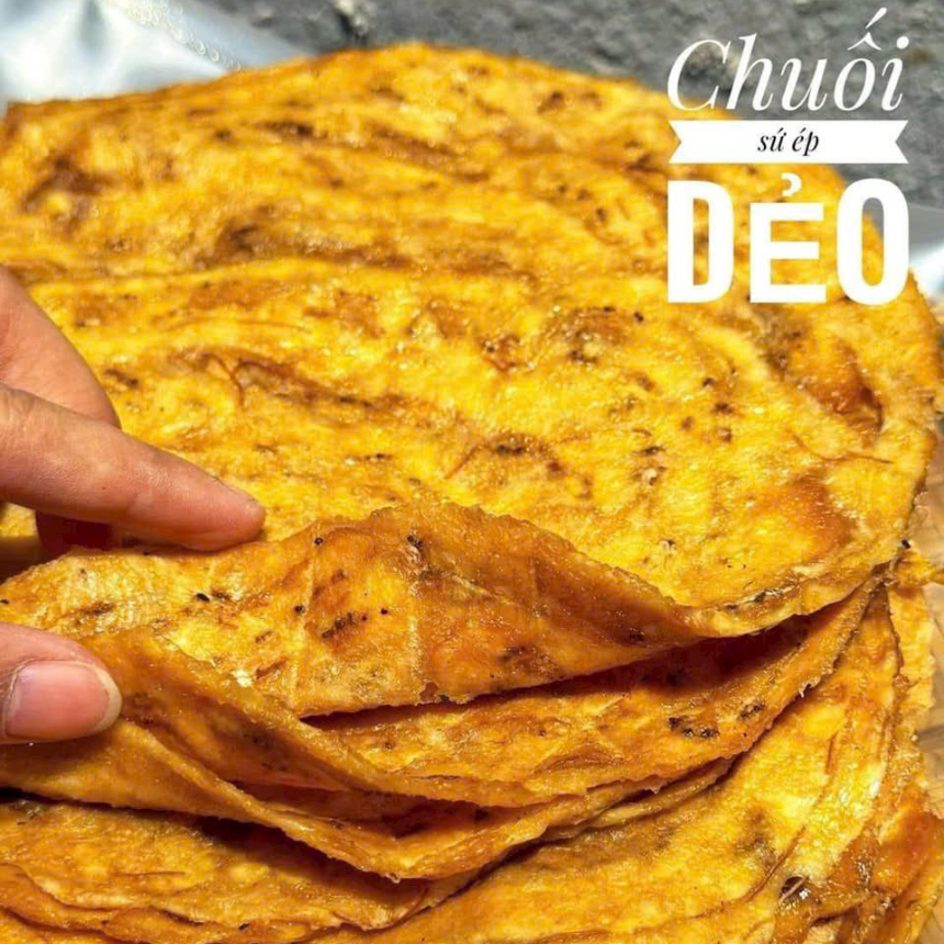 Hàng nha e là chuối xiêm đen ép mỏng ra vĩ phơi nắng đến khi khô , nên chuối ép khô rất dẻo , ngọt của mật chuối tươm ra , chứ ko phải hàng sấy lò công nghiệp nha khách