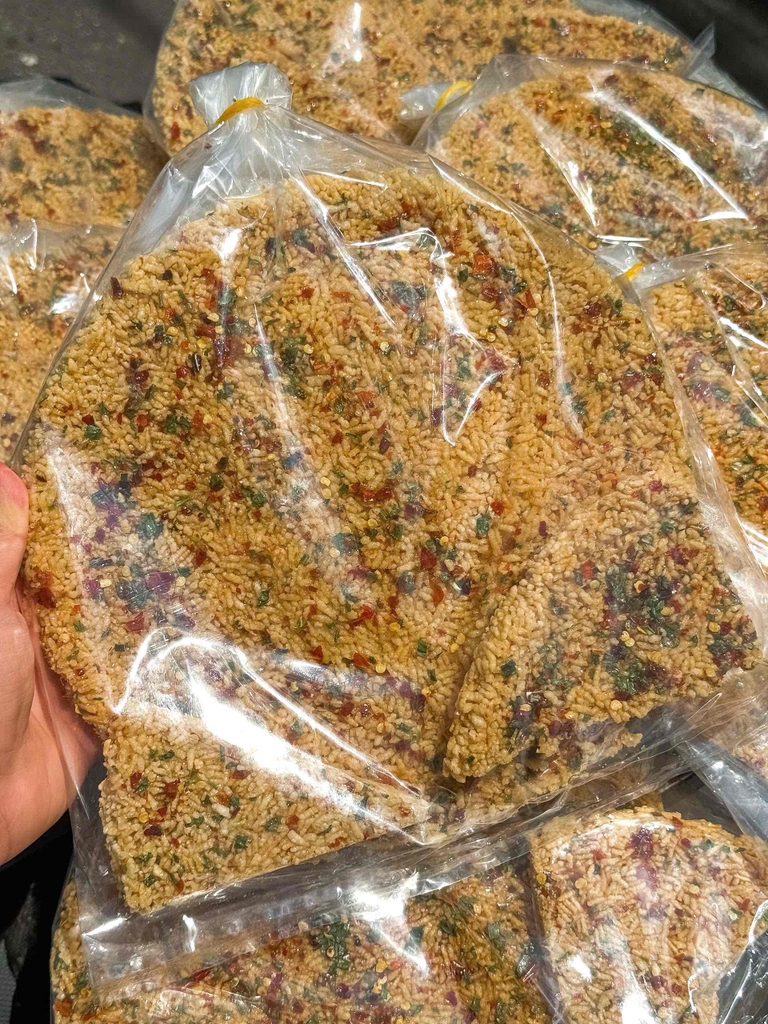 Miếng cơm giòn tan,vị đậm đà của nước mắm,thơm thơm của hành và cay cay của ớt hoà quyện.Miếng cơm thơm ngon giòn rụm,được sấy trên lò sấy công nghệ cao!