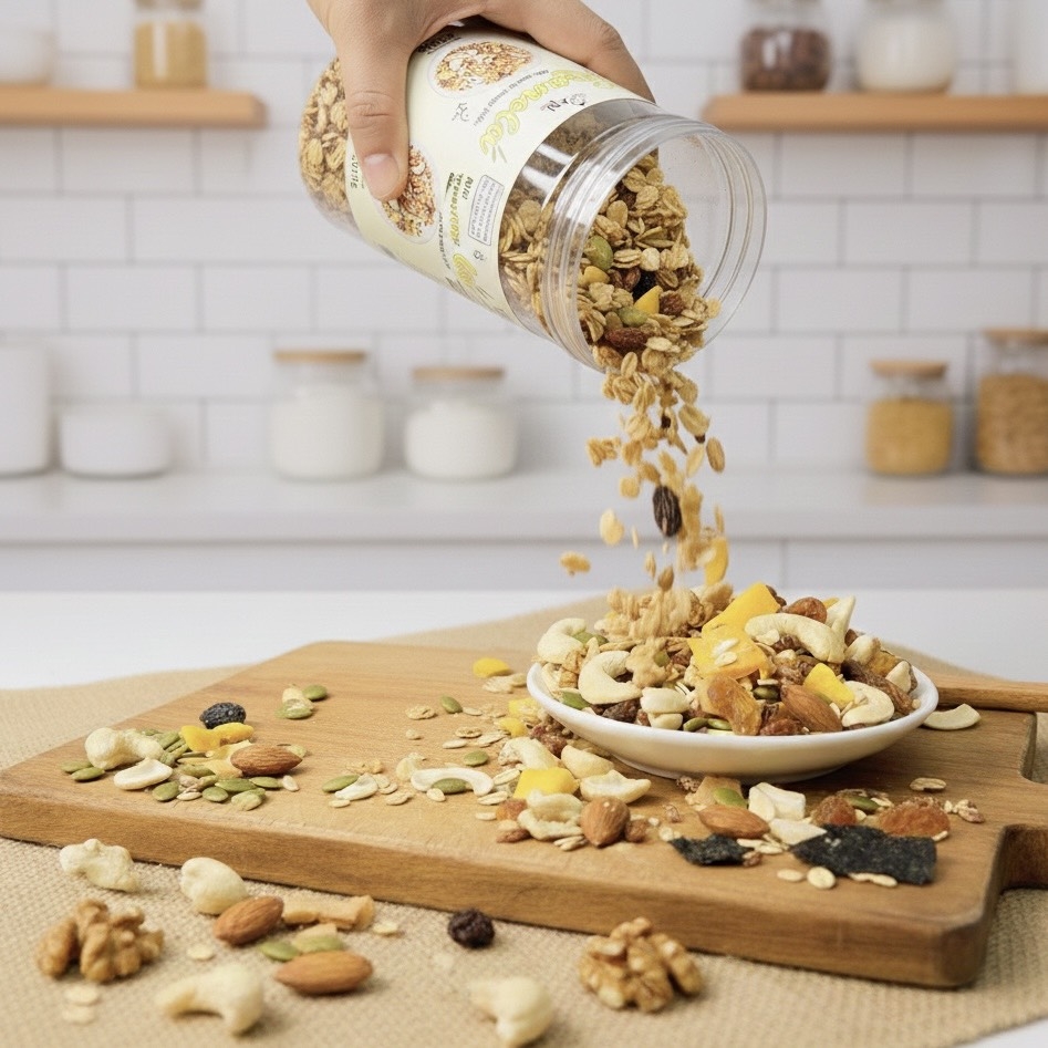 - Các loại hạt và trái cây sấy khô bao gồm: hạt điều sữa, hạnh nhân, óc chó, hạt bí, nho khô, xoài sấy, dừa sấy, yến mạch, mật ong.