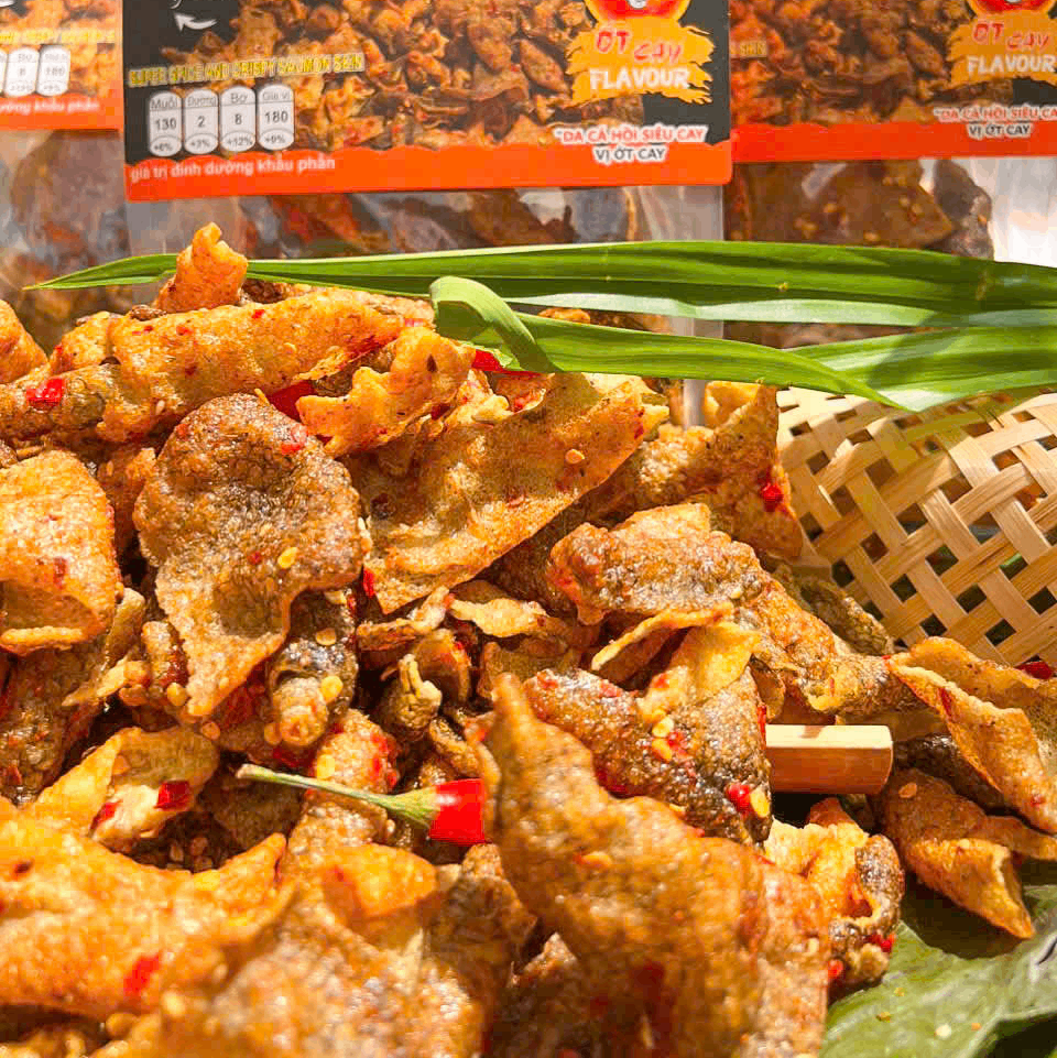 Da cá hồi được tuyển chọn kỹ lưỡng, chiên giòn vàng ruộm và phủ đều lớp sốt siêu cay đậm đà, tạo nên hương vị vừa cay nồng kích thích vị giác, vừa béo béo giòn rụm cực cuốn. Cắn một miếng là cảm nhận ngay vị mặn nhẹ, thơm ngậy của da cá hòa quyện cùng vị cay xé lưỡi – ăn hoài không ngán!