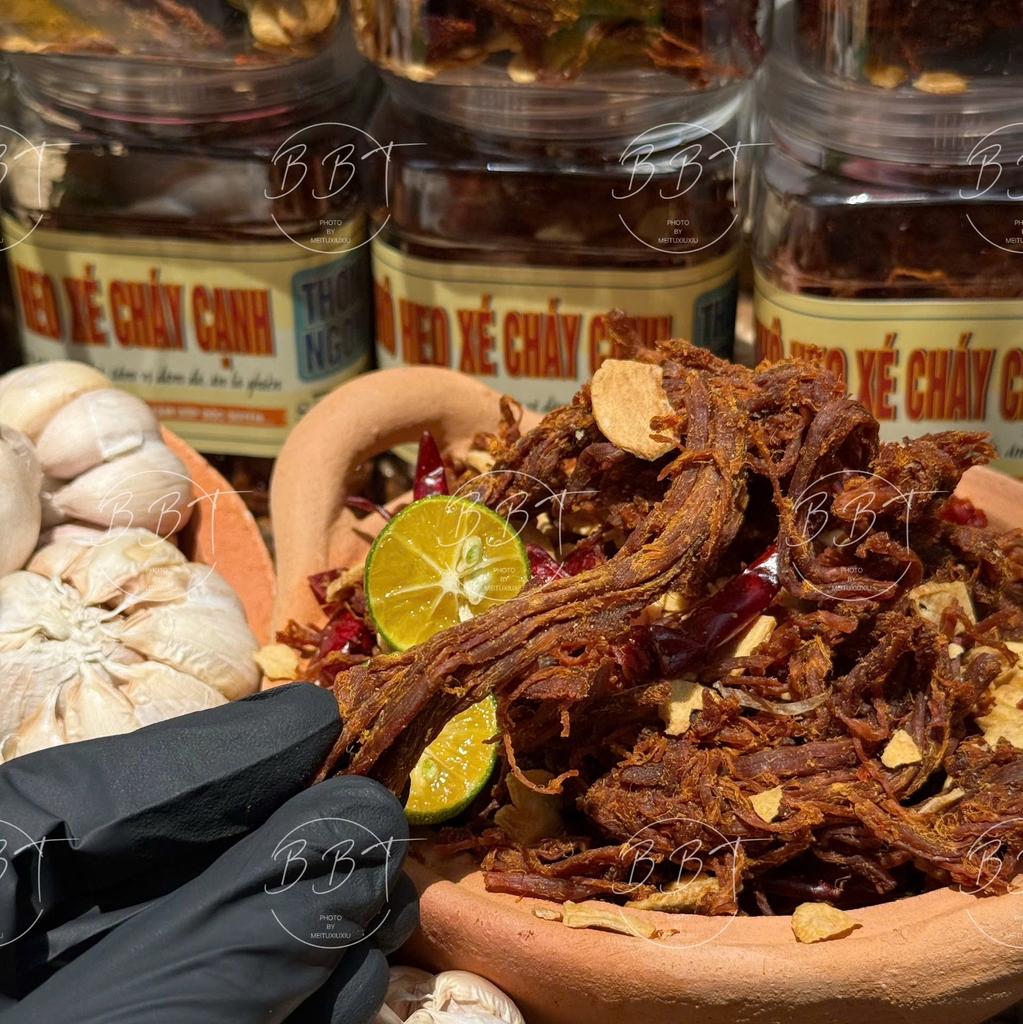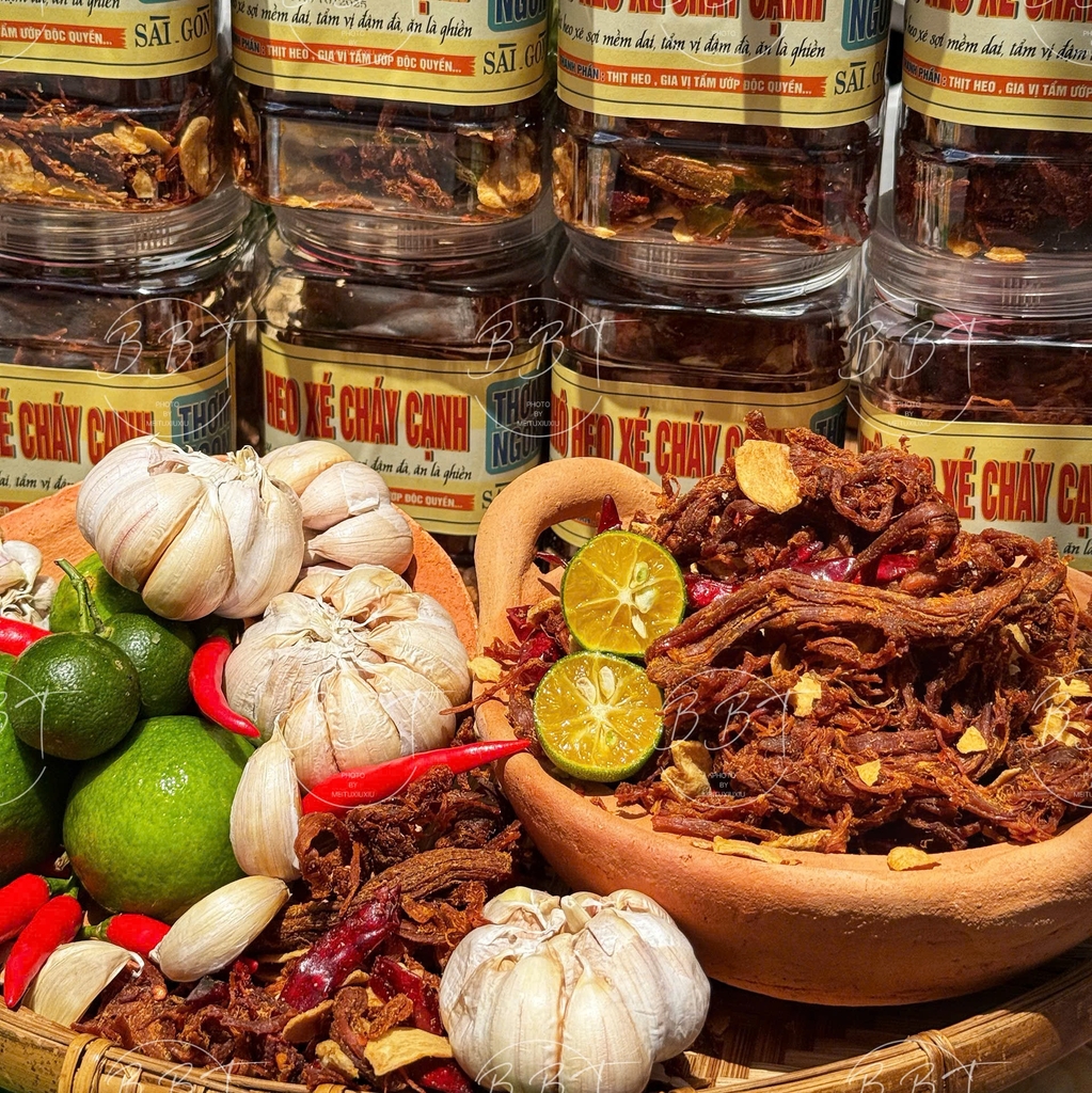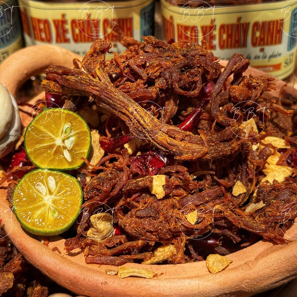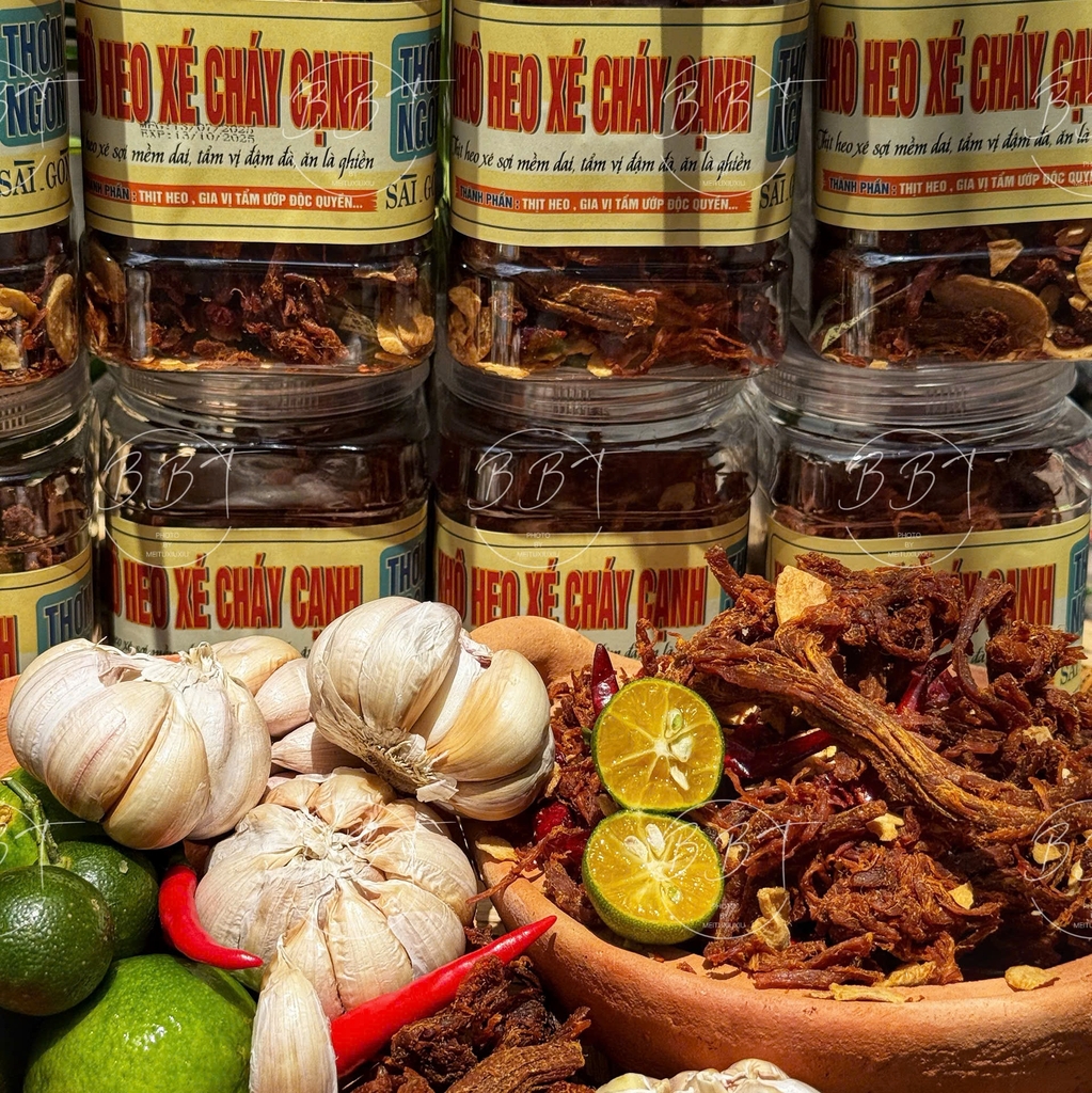 Khô Heo Xé Cháy Cạnh là món ăn vặt cao cấp, được chế biến từ thịt heo tươi nguyên chất, mang đến hương vị bùng nổ và trải nghiệm ăn uống khó quên. Sản phẩm là sự kết hợp hoàn hảo giữa công thức truyền thống và quy trình chế biến hiện đại, đảm bảo từng sợi khô heo đạt độ hoàn hảo về hương vị và chất lượng.