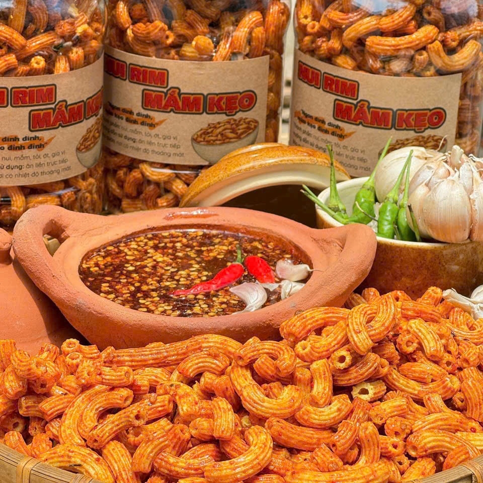 Nui rim mắm kẹo là món ăn vặt dân dã nhưng “gây thương nhớ” với hương vị đậm đà khó quên. Nui (một loại pasta dạng ống) được chọn lọc kỹ, chiên vàng giòn rụm, sau đó rim cùng hỗn hợp nước mắm và đường được nấu sánh kẹo. Quá trình rim giúp từng miếng nui thấm đều gia vị, tạo nên vị mặn ngọt hài hòa, thơm lừng và hấp dẫn.