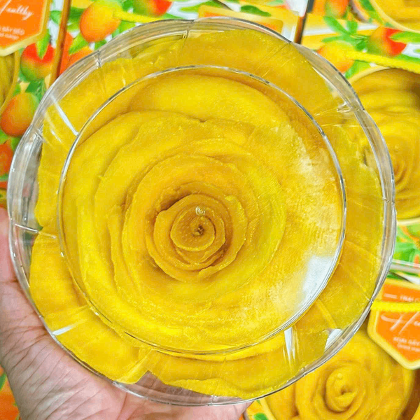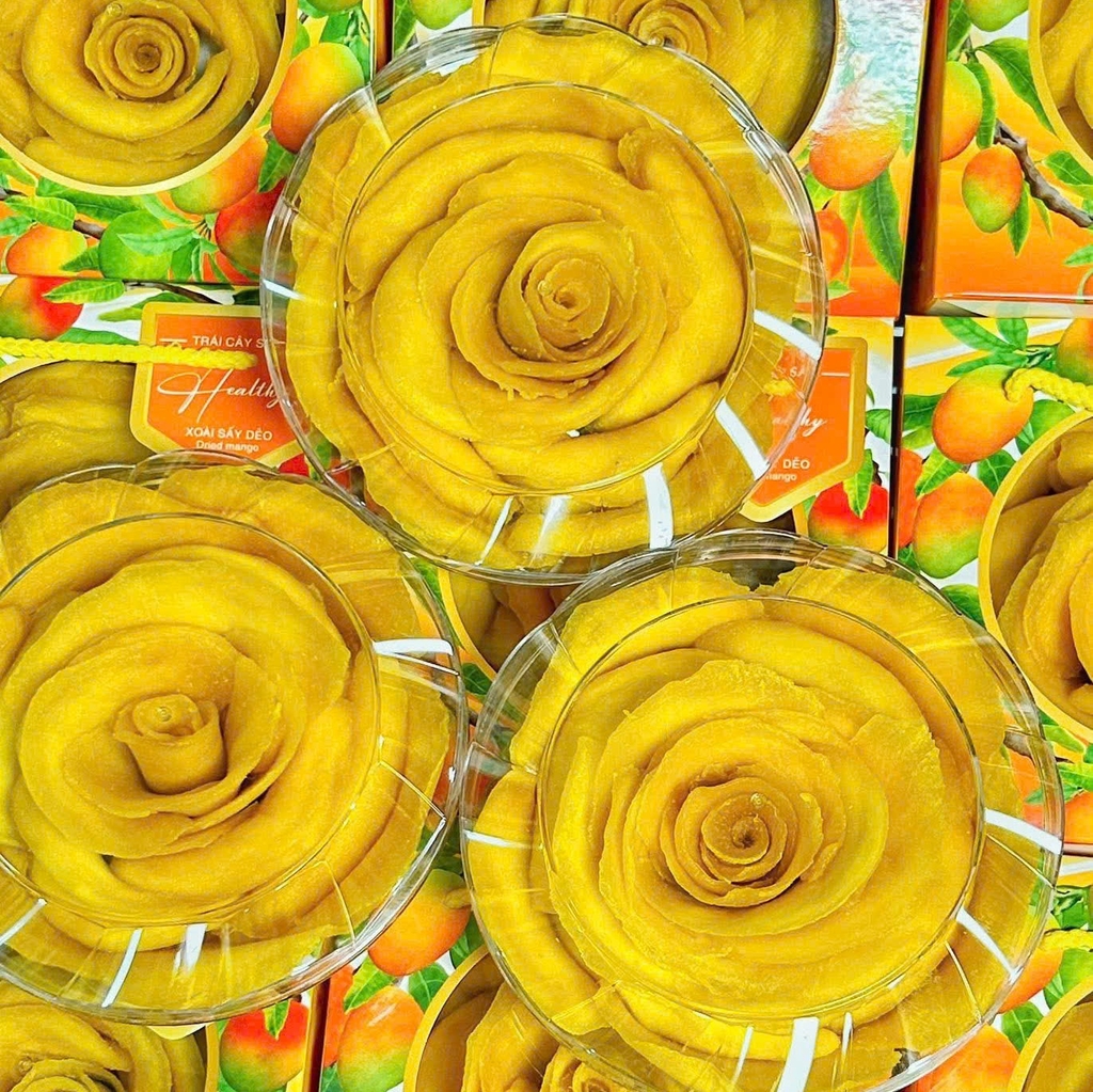 Xoài sấy dẻo xếp hoa hồng là sự kết hợp hoàn hảo giữa vị ngọt thanh tự nhiên của xoài chín và sự sáng tạo trong cách trình bày thủ công tinh tế. Mỗi bông hoa được cuốn tỉ mỉ từ từng lát xoài sấy dẻo vàng óng, vừa đẹp mắt vừa giữ trọn hương vị tươi ngon của trái cây tự nhiên.